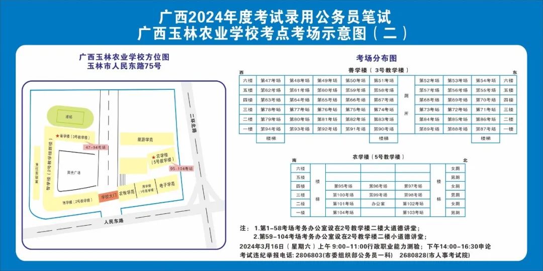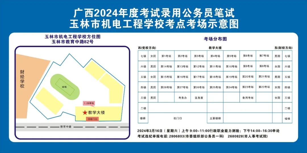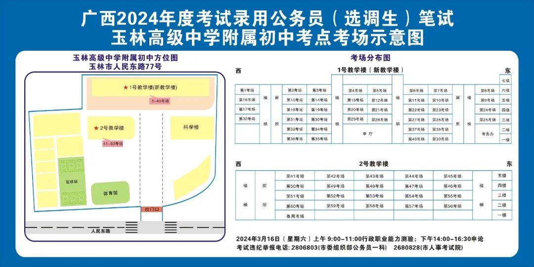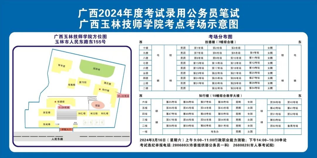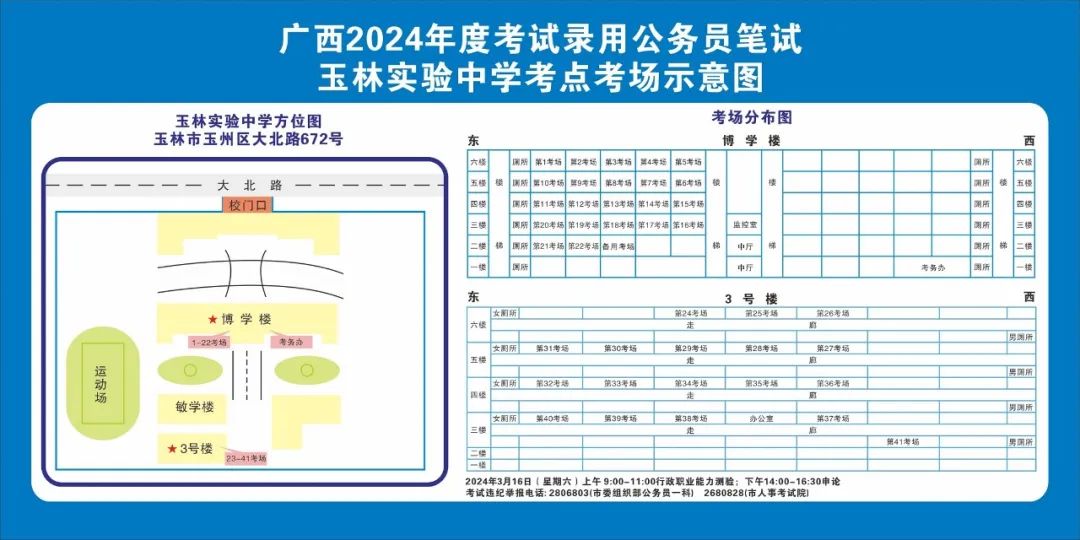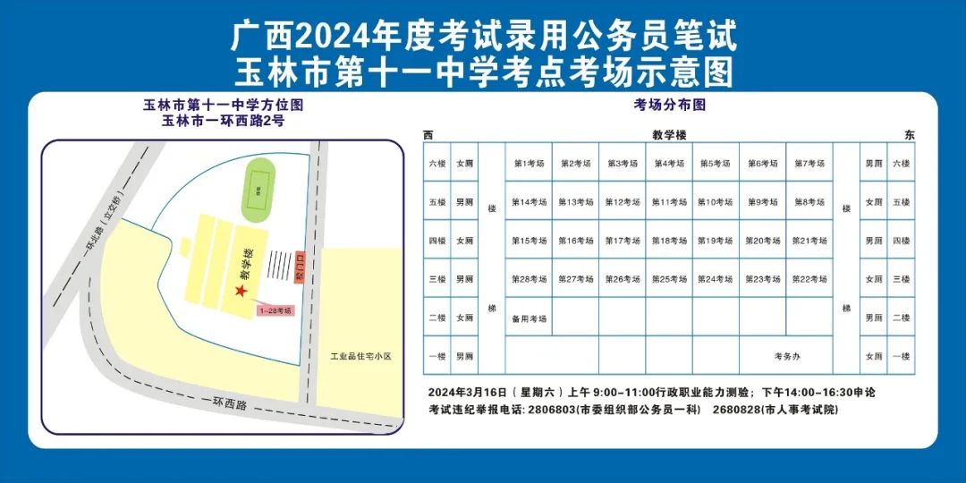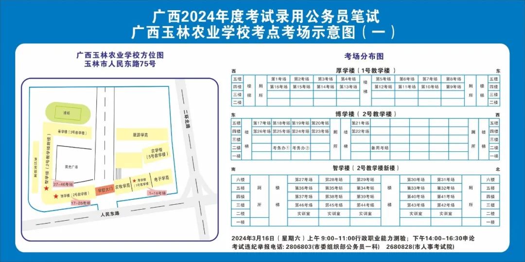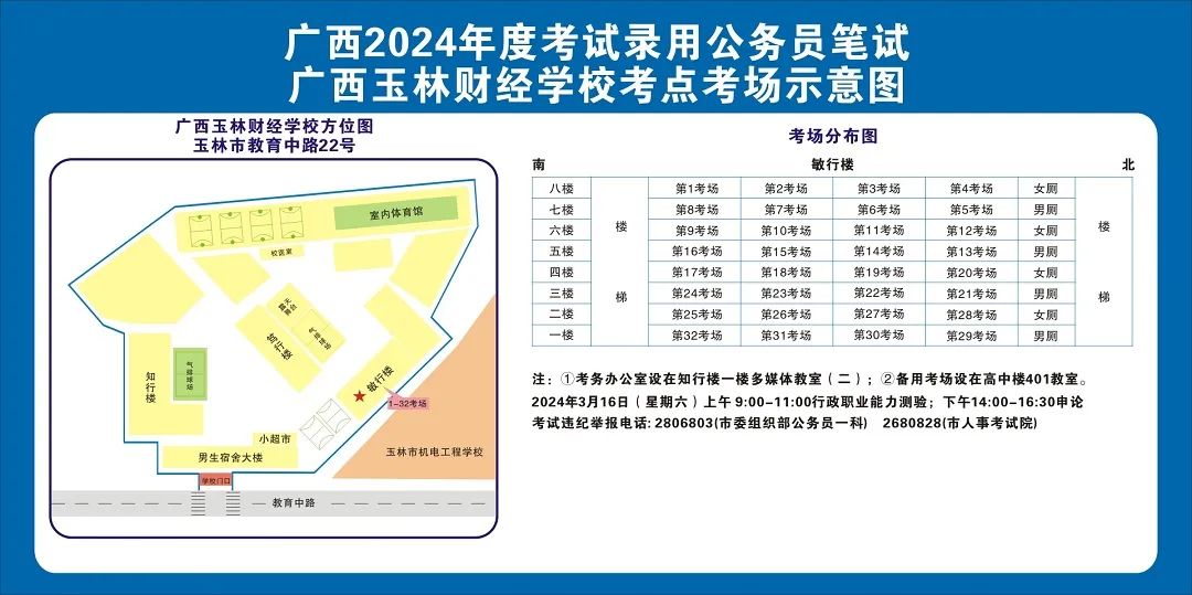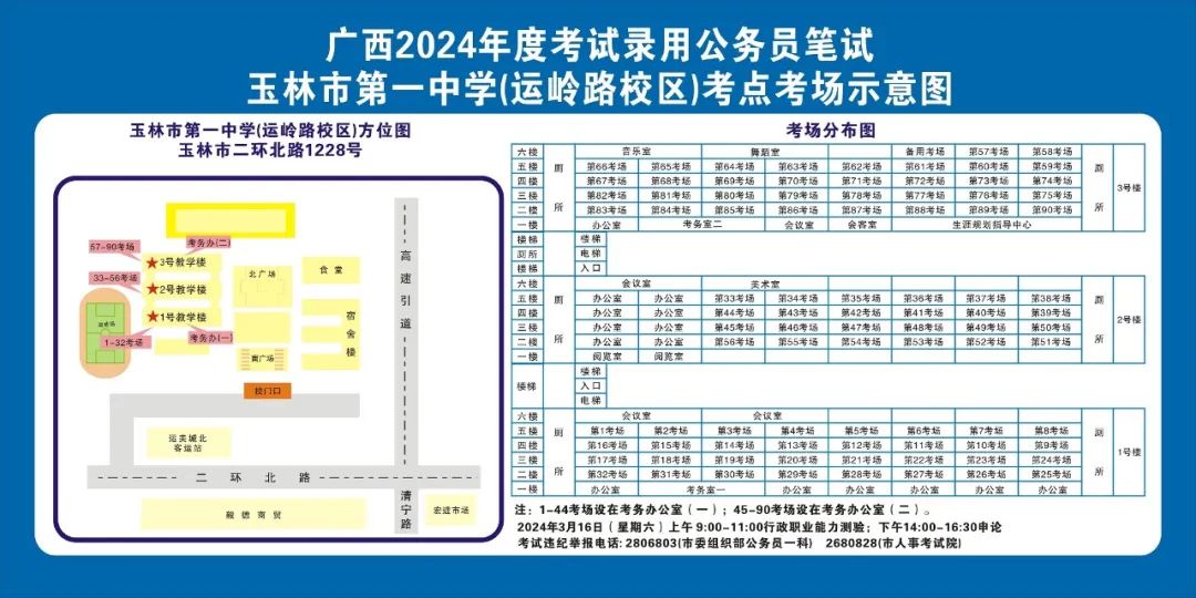 除考試當(dāng)天考生可以進入考點外,考生不得提前進入考點查看考場(學(xué)校將在大門處擺放考場分布示意圖),玉林考區(qū)10個考點的考場布置情況如下: