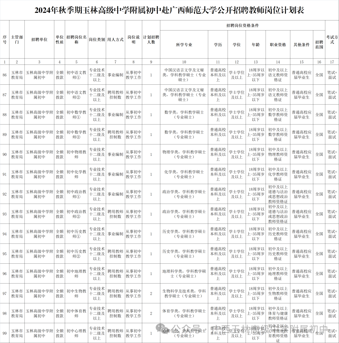 具體招聘信息請瀏覽玉林市人社局網(wǎng)站相關(guān)公告http://rsj.yulin.gov.cn/tszl/rsrc/sydwzk/t19343053.shtml,以《2024年秋季期玉林市教育局直屬學(xué)校赴廣西師范大學(xué)公開招聘教師公告》為準(zhǔn)。