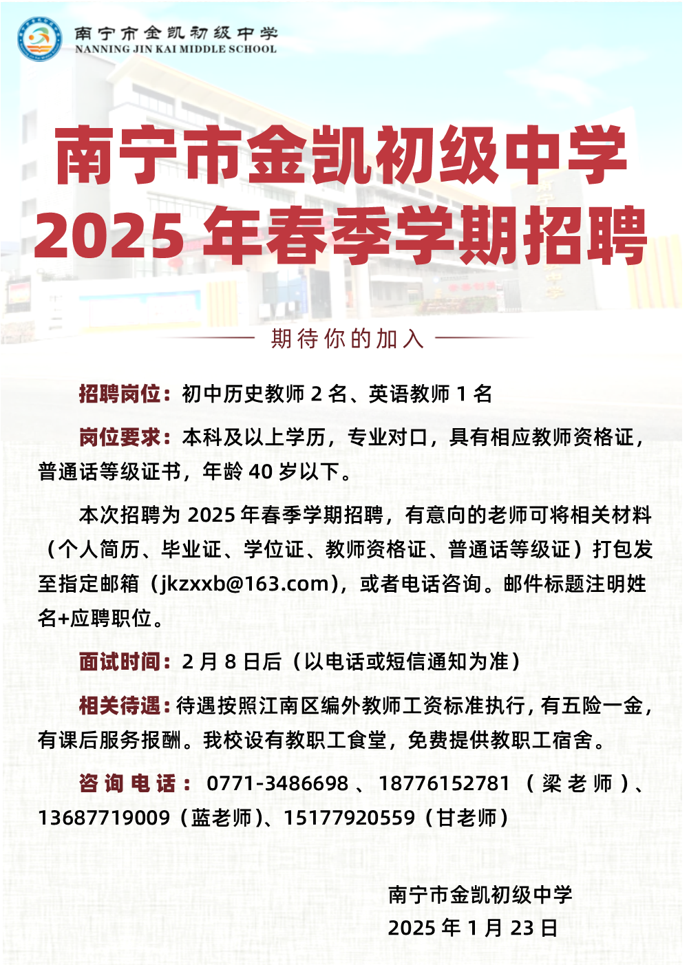 2025年南寧市金凱初級中學(xué)誠聘歷史、英語教師