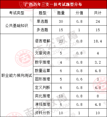 上篇我們寫到,三支一扶的待遇,在廣西這個待遇還算不錯,政策上的支持也非常好,那么預(yù)計這個月月底出公告的三支一扶,啥時候筆試呢?2024年廣西三支一扶筆試時間是7月13日,其筆試科目為《綜合知識》一科,滿分100分?;谕昕忌幕貞洠C合知識內(nèi)容主要包括公共基礎(chǔ)知識和行測職業(yè)能力測試兩個科目,而各題型的題量及分值如下圖所示: