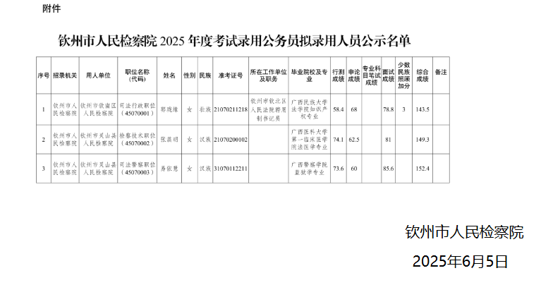 根據(jù)《廣西壯族自治區(qū)2025年度考試錄用公務(wù)員公告》等有關(guān)規(guī)定,我單位2025年計(jì)劃招錄3名公務(wù)員,經(jīng)過公開報(bào)名、資格審查、筆試、面試、體檢、考察等程序,擬錄用郭瓏緣等3名同志(附件)為公務(wù)員,現(xiàn)予以公示。公示期5個(gè)工作日,如對(duì)擬錄用人員的錄用資格有異議,請(qǐng)?jiān)诠酒趦?nèi)向欽州市人民檢察院政治部實(shí)名反映。
