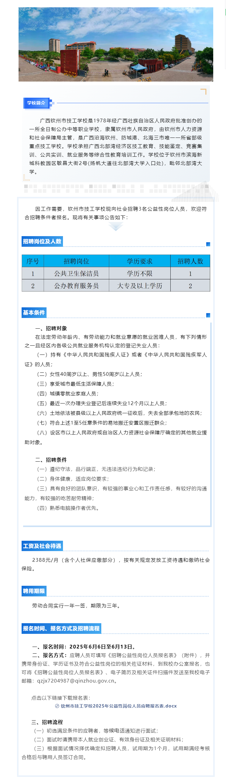 原文標題:欽州市技工學(xué)校招聘公益性崗位人員公告
