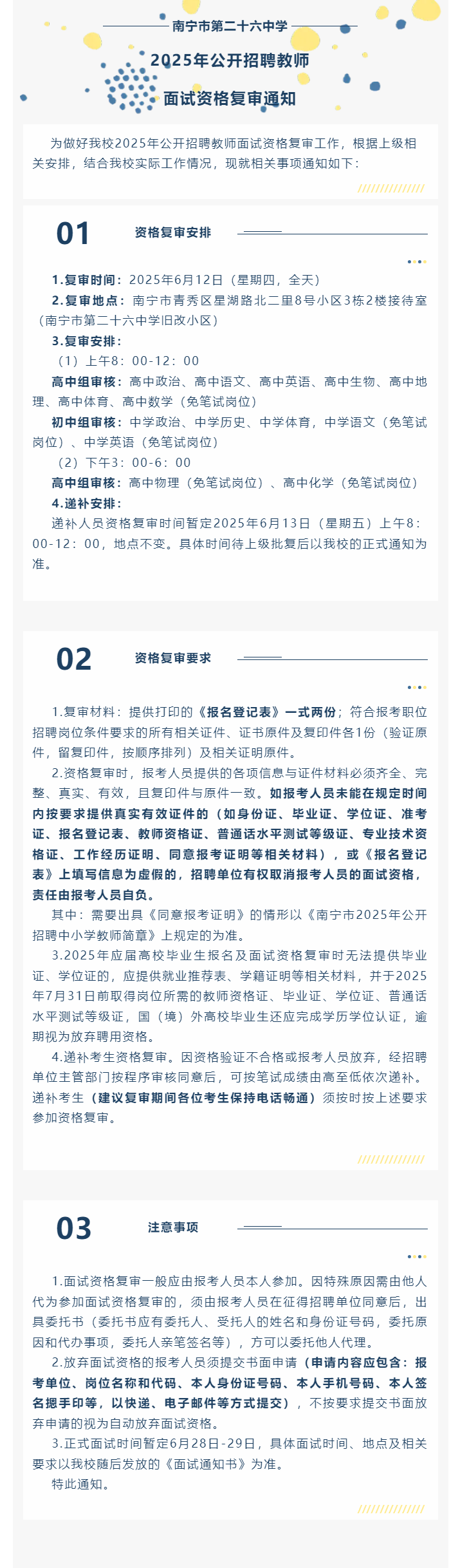 南寧市第二十六中學2025年公開招聘教師面試資格復審通知