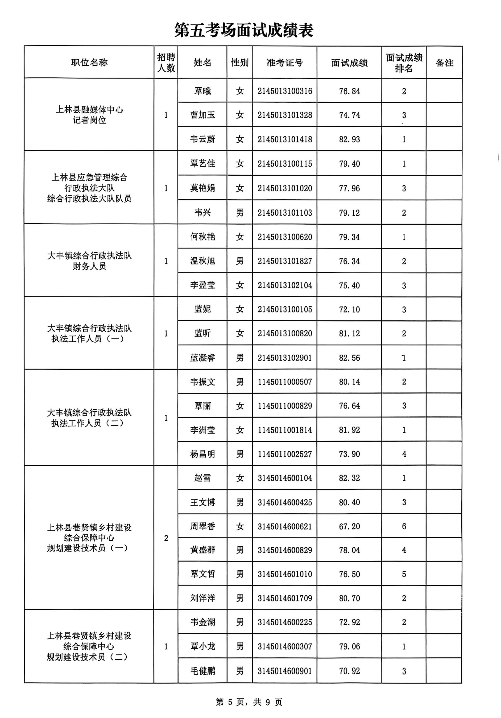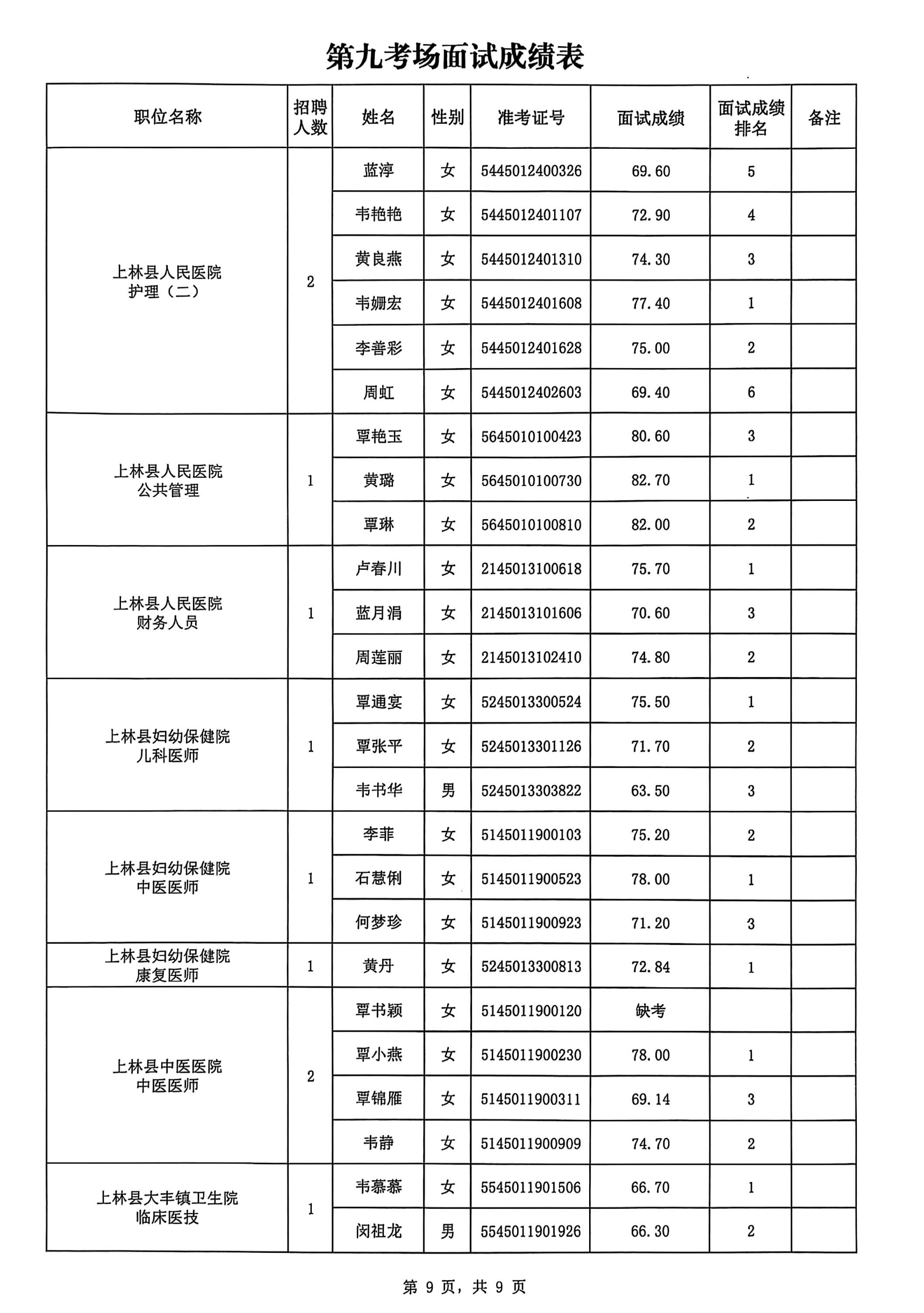 上林縣2025年公開(kāi)考試招聘事業(yè)單位工作人員面試成績(jī)