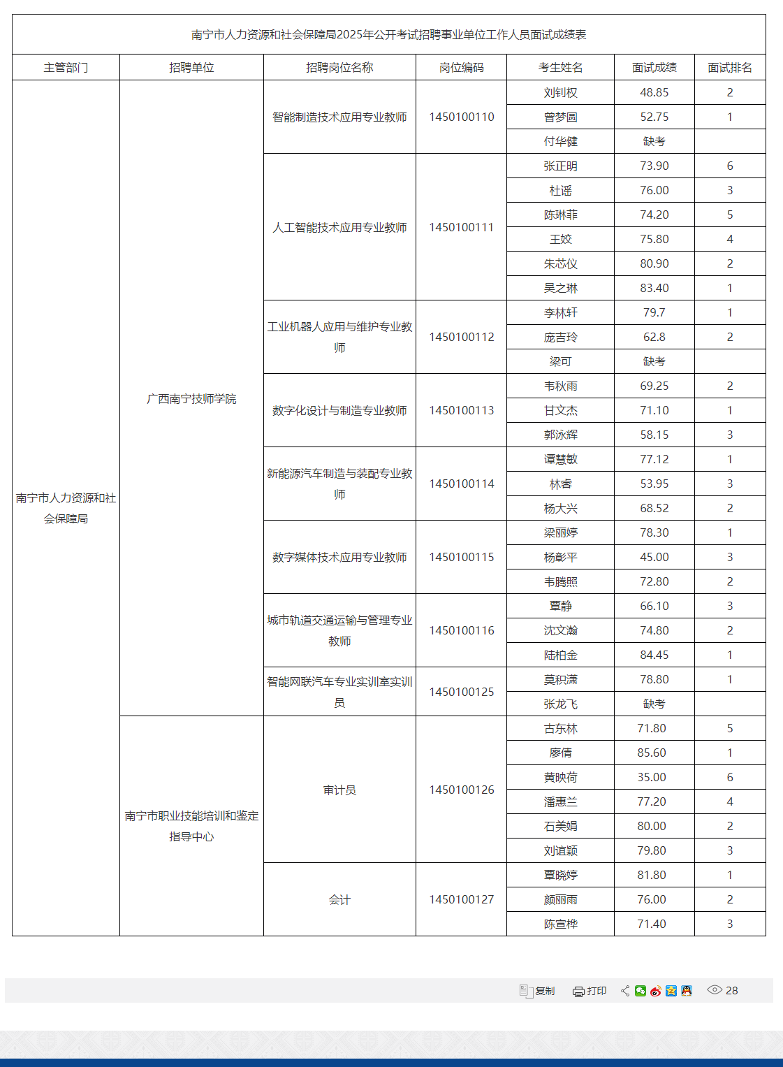南寧市人力資源和社會(huì)保障局2025年公開考試招聘事業(yè)單位工作人員面試成績(jī)表