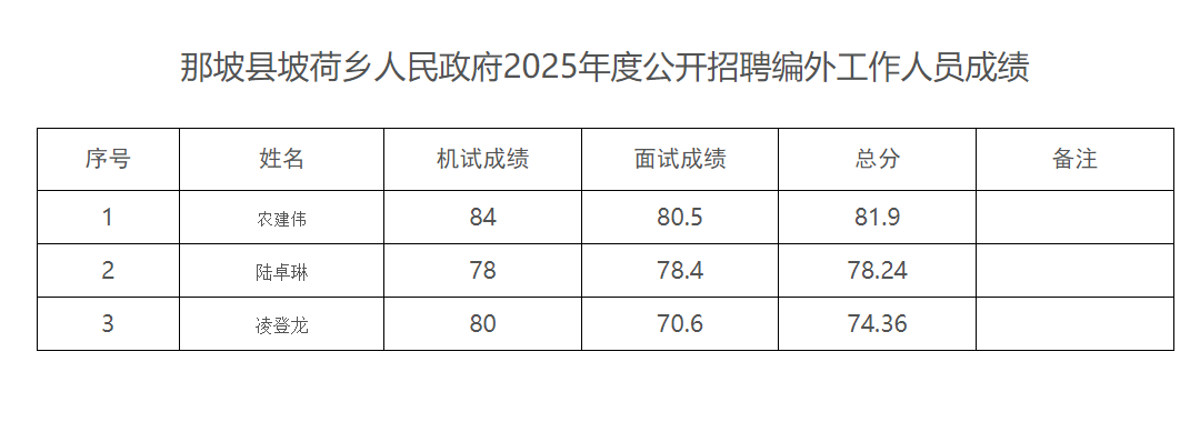 那坡縣坡荷鄉(xiāng)人民政府2025年度公開招聘編外工作人員成績公示