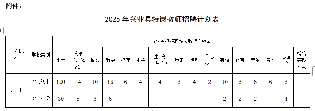 附件: 2025年興業(yè)縣特崗教師招聘計(jì)劃表