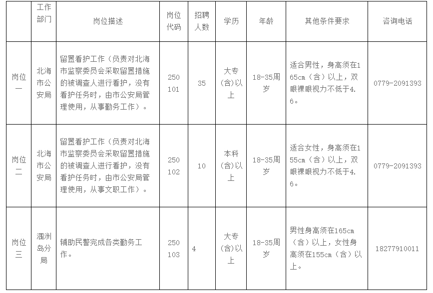 有關(guān)招聘信息,應(yīng)聘人員可登錄北海市人才網(wǎng)(www.bhrc.cn)、北海市公安局微信公眾號“北海公安”查詢。咨詢報考崗位、資格條件等信息,可在工作時間內(nèi)致電各崗位咨詢電話。