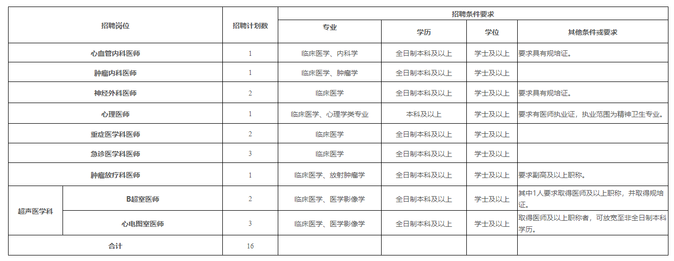注:初中級職稱應聘人員原則上年齡要求為35周歲及以下;如為副高以上職稱,年齡可放寬至45周歲;學歷層次高者優(yōu)先。醫(yī)師崗位中如要求具有規(guī)培證條件的是指已取得規(guī)培合格證書(含通過規(guī)培結(jié)業(yè)考試未領(lǐng)合格證書)或已取得中級及以上職稱人員。