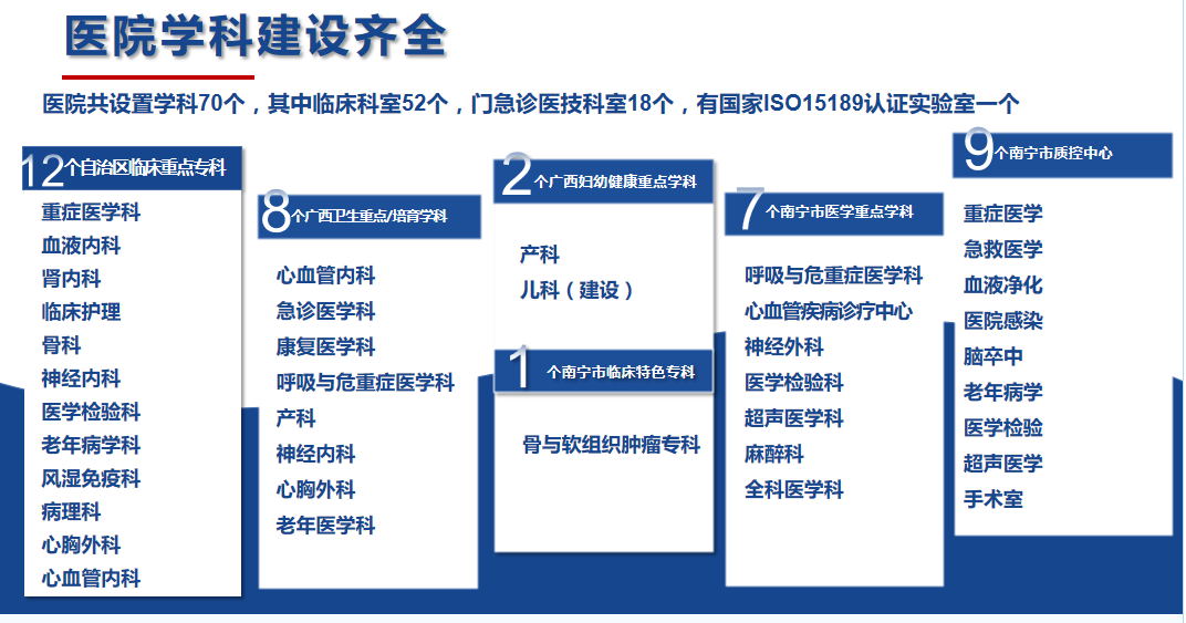南寧市第一人民醫(yī)院(南寧市兒童先天性心血管疾病研究所、南寧市呼吸道疾病研究所、廣西醫(yī)科大學(xué)第五臨床醫(yī)學(xué)院、廣西醫(yī)科大學(xué)第五附屬醫(yī)院)始建于1914年,是一家擁有百年歷史的國家三級甲等綜合性醫(yī)院。醫(yī)院設(shè)有52個(gè)臨床病區(qū),18個(gè)門診醫(yī)技科室,總開放床位1912張(含分院)。醫(yī)院是國家高級認(rèn)知中心建設(shè)單位及國家神經(jīng)介入建設(shè)中心、國家ISO15189醫(yī)學(xué)檢驗(yàn)認(rèn)證機(jī)構(gòu),國家聯(lián)盟中心認(rèn)證的胸痛中心、卒中中心;擁有廣西臨床重點(diǎn)??疲ê嘤?2個(gè)、自治區(qū)醫(yī)療衛(wèi)生重點(diǎn)學(xué)科(含培育)8個(gè)、自治區(qū)婦幼健康服務(wù)重點(diǎn)學(xué)科(含建設(shè))2個(gè)、南寧市醫(yī)學(xué)重點(diǎn)學(xué)科7個(gè)、南寧市臨床特色優(yōu)勢專科1個(gè),南寧市質(zhì)控中心9個(gè)。醫(yī)院是國家衛(wèi)健委創(chuàng)面修復(fù)能力建設(shè)和繼續(xù)教育中心教學(xué)基地、國家級住院醫(yī)師規(guī)范化培訓(xùn)培訓(xùn)基地,廣西醫(yī)科大學(xué)碩士研究生培養(yǎng)基地,同時(shí)是暨南大學(xué)共建醫(yī)學(xué)教育基地、第十批廣西博士后創(chuàng)新實(shí)踐基地;醫(yī)院還具備國家藥物臨床試驗(yàn)機(jī)構(gòu)資質(zhì)(含I期研究室);醫(yī)院醫(yī)學(xué)實(shí)驗(yàn)中心獲批廣西科技廳重點(diǎn)實(shí)驗(yàn)室“廣西智慧精準(zhǔn)醫(yī)學(xué)實(shí)驗(yàn)室”,是南寧市衛(wèi)健系統(tǒng)唯一的省級重點(diǎn)建設(shè)實(shí)驗(yàn)室。2019年在市委市政府支持下,成立南寧市第一人民醫(yī)院醫(yī)療集團(tuán)。現(xiàn)有27家成員單位,形成“1+4+22”(中心醫(yī)院+4家二級醫(yī)院+22家基層衛(wèi)生及養(yǎng)老機(jī)構(gòu))一體化格局,推行“三二一”運(yùn)營管理模式,逐步構(gòu)建全生命周期健康管理鏈。