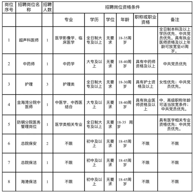 為了解決醫(yī)院人員緊缺狀態(tài),完善科室設(shè)置,進(jìn)一步提升醫(yī)療服務(wù)水平,確保醫(yī)療安全,更好地滿足企沙工業(yè)園區(qū)各大企業(yè)及廣大人民群眾醫(yī)療服務(wù)需求,特面向社會招聘11名工作人員,具體如下: