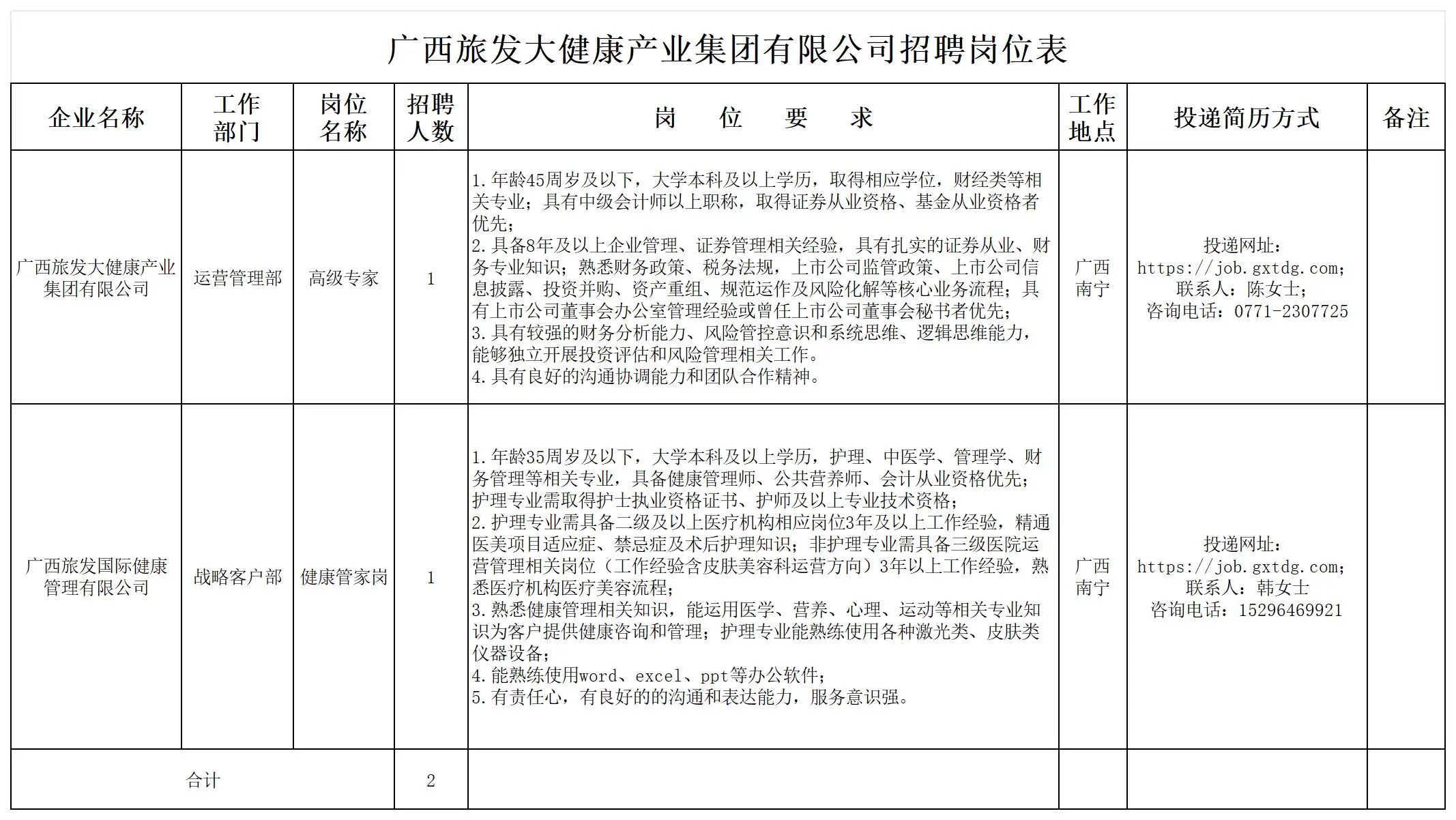 廣西旅發(fā)大健康產(chǎn)業(yè)集團有限公司有關(guān)崗位員工2名(詳見招聘崗位表)。