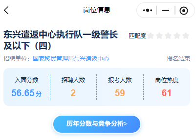 其中東興遣返中心執(zhí)行隊(duì)一級警長及以下(四)崗位歷年入面分為56.65分、報(bào)考人數(shù)為59人↓