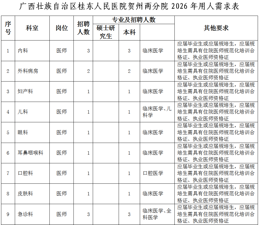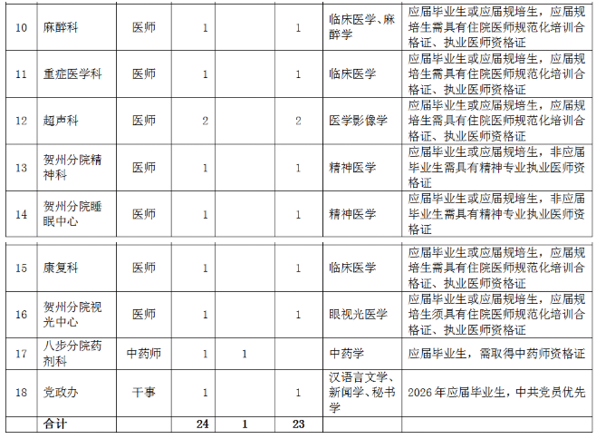(應(yīng)聘報(bào)名二維碼)同時(shí),按以下要求提供個(gè)人應(yīng)聘材料(電子版)發(fā)電子郵箱:gdyy2817726@163.com(郵件主題請(qǐng)標(biāo)明:“姓名+賀州兩分院”字樣)。應(yīng)屆畢業(yè)生:個(gè)人簡歷、身份證、就業(yè)推薦表、成績單、各種獎(jiǎng)項(xiàng)獎(jiǎng)勵(lì)證書、外語等級(jí)證書等。非應(yīng)屆畢業(yè)生:個(gè)人簡歷、身份證、畢業(yè)證、畢業(yè)證備案登記表、學(xué)位證、學(xué)位證備案登記表、職稱證、執(zhí)業(yè)證、住院醫(yī)師規(guī)范化培訓(xùn)合格證、工作證明等。報(bào)名時(shí)所提交的申請(qǐng)材料必須真實(shí)、準(zhǔn)確,因報(bào)名時(shí)提交的申請(qǐng)材料不真實(shí)、不完整或錯(cuò)誤填寫報(bào)名信息,造成資格審查、面試資格審查不通過的,后果由報(bào)名人員自行承擔(dān)。(2)資格審核。人事科依據(jù)招聘公告和用人需求規(guī)定的資格條件對(duì)應(yīng)聘人員簡歷進(jìn)行收集和資格初步審查,經(jīng)招聘工作領(lǐng)導(dǎo)小組審核后,確定符合崗位條件報(bào)名人員名單,由醫(yī)院人事科電話或短信通知符合條件人員。(3)考核??己斯P試和面試由人事科負(fù)責(zé)組織實(shí)施,協(xié)助部門為醫(yī)務(wù)部、護(hù)理部、科教科以及用人科室,紀(jì)律監(jiān)督部門為監(jiān)察室。逾期未參加則視為自愿放棄。(4)試工。通過考核的非應(yīng)屆畢業(yè)應(yīng)聘人員,須到醫(yī)院試工5天。試工不通過,不予聘用。(5)體檢。體檢工作由廣西壯族自治區(qū)桂東人民醫(yī)院按照有關(guān)規(guī)定統(tǒng)一組織。體檢標(biāo)準(zhǔn)參照《廣西壯族自治區(qū)事業(yè)單位公開招聘人員體檢通用標(biāo)準(zhǔn)(試行)》《廣西壯族自治區(qū)事業(yè)單位公開招聘人員體檢操作手冊(cè)(試行)》執(zhí)行。體檢不合格或隱瞞真實(shí)情況致使體檢結(jié)果失真的,不予聘用。因體檢不合格空缺崗位的,將按考核的綜合成績,從高到低,順位補(bǔ)充體檢人員。(6)公示和聘用。對(duì)擬聘非應(yīng)屆畢業(yè)應(yīng)聘者在全院范圍內(nèi)進(jìn)行公示,公示期為5個(gè)工作日,公示期滿無異議按程序辦理聘用手續(xù)。對(duì)公示有異議,經(jīng)核實(shí)影響聘用的,取消其聘用資格;對(duì)反映問題難以核實(shí)的暫緩聘用,待核實(shí)清楚后按有關(guān)規(guī)定辦理。