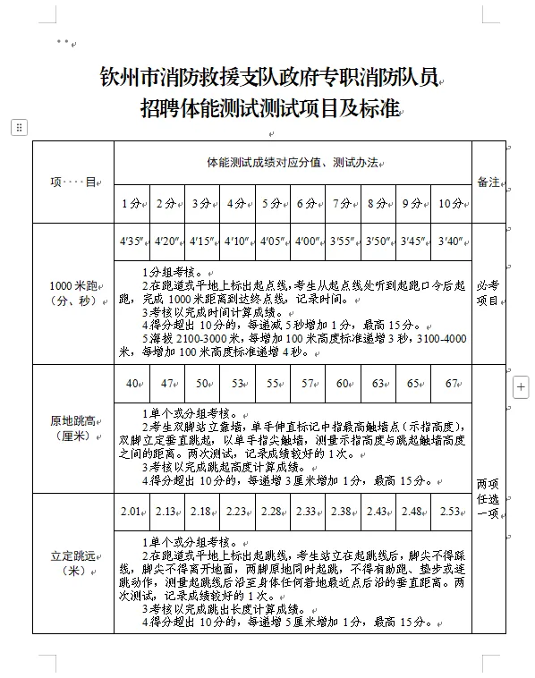 2.體能測試:(1)必考項目:1000米跑;(2)選考項目:①立定跳遠、原地跳高二選一;②單杠引體向上、俯臥撐二選一;③10米×4往返跑、100米跑二選一;(3)注意事項:應聘人員須參加體能測試,并當場簽訂《體能測試健康安全風險承諾書》,體能測試有兩項及兩項以上不得分的視為不合格(標準參照附件)。未按時參加或因身體原因無法測試者,視為自動放棄。(體能測試測試項目及標準附后)