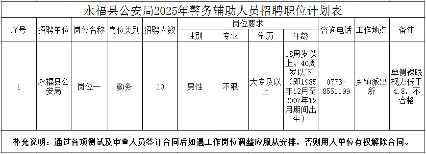 對確定聘用的警務輔助人員與永??h公安局簽訂勞動合同(合同期三年,試用期六個月,試用期滿經考核不適合崗位工作的,解除聘用合同),從事警務輔助工作。警務輔助人員依法履行輔助性工作職責,由公安機關管理使用、不具有人民警察身份,在公安機關及其人民警察的指揮和監(jiān)督下開展輔助性工作。