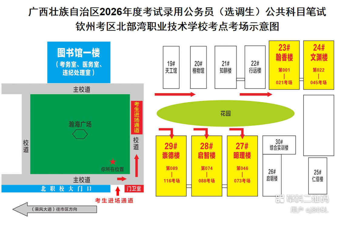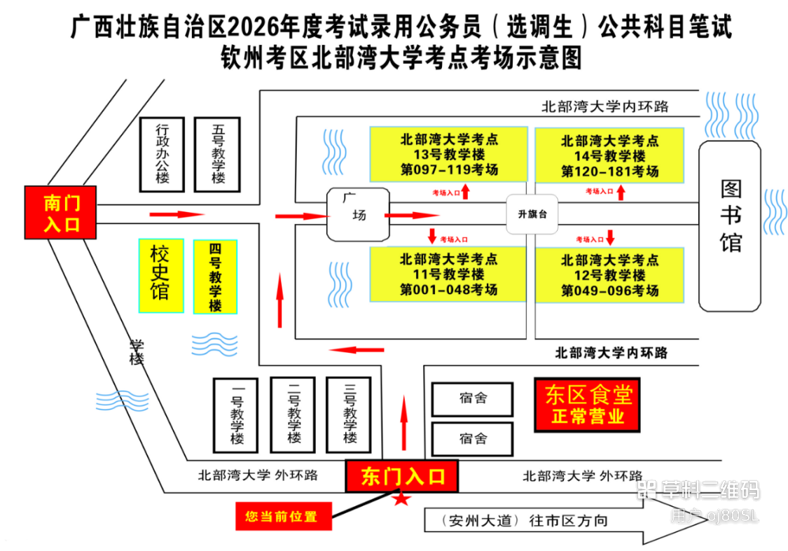 欽州考區(qū)共設三個考點,分別為北部灣大學考點、北部灣職業(yè)技術學校考點、欽州市第五中學考點。(考點地址和具體考場安排請掃附后的二維碼查看)