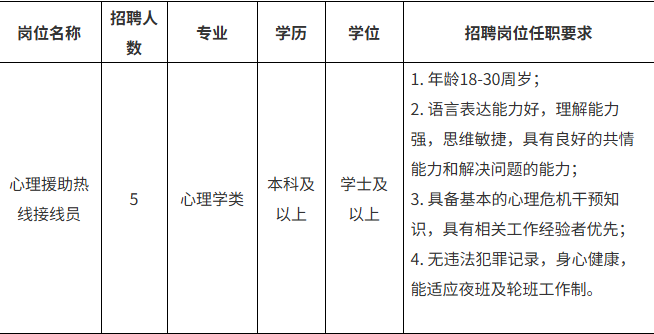 醫(yī)院承接“12356全國(guó)統(tǒng)一心理援助熱線”,提供24小時(shí)不間斷服務(wù)模式,由專職心理咨詢師、心理治療師及精神科醫(yī)護(hù)人員組成專業(yè)團(tuán)隊(duì),為來(lái)電者提供心理教育、心理咨詢、危機(jī)干預(yù)及心理健康科普服務(wù),覆蓋情緒舒緩、家庭關(guān)系、青少年心理咨詢等多類問(wèn)題,為自殺高危人群提供快速響應(yīng)與轉(zhuǎn)介服務(wù)。為進(jìn)一步提升心理服務(wù)質(zhì)量、補(bǔ)充現(xiàn)有接線員力量,為公眾提供更優(yōu)質(zhì)、專業(yè)、高效的心理健康服務(wù),現(xiàn)面向社會(huì)招聘5名接線員。